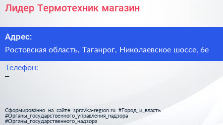 Лидер Термотехник, магазин по адресу Ростовская область, Таганрог, Николаевское шоссе, 6е в дальнейшем Организация, размещена в следующих категориях: