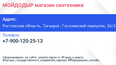 МОЙДОДЫР, магазин сантехники по адресу Ростовская область, Таганрог, Гоголевский переулок, 26/1 в дальнейшем Организация, размещена в следующих категориях: