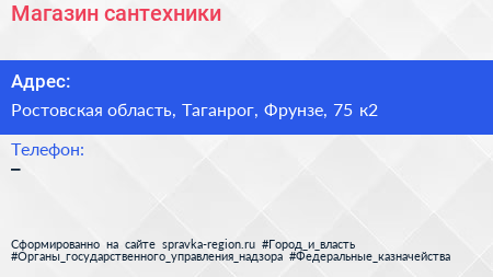 Магазин сантехники по адресу Ростовская область, Таганрог, Фрунзе, 75 к2 в дальнейшем Организация, размещена в следующих категориях:
