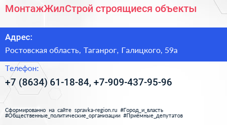 МонтажЖилСтрой, строящиеся объекты по адресу Ростовская область, Таганрог, Галицкого, 59а в дальнейшем Организация, размещена в следующих категориях: