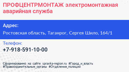ПРОФЦЕНТРМОНТАЖ, электромонтажная аварийная служба по адресу Ростовская область, Таганрог, Сергея Шило, 164/1 в дальнейшем Организация, размещена в следующих категориях: