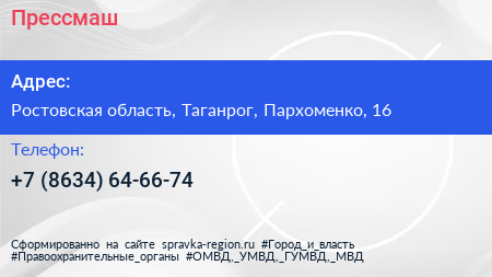 Прессмаш по адресу Ростовская область, Таганрог, Пархоменко, 16 в дальнейшем Организация, размещена в следующих категориях: