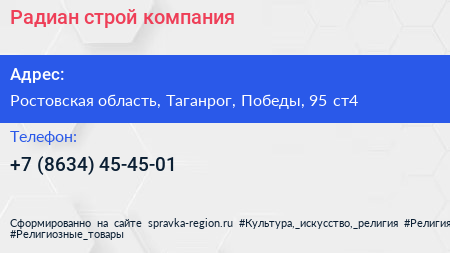 Радиан строй, компания по адресу Ростовская область, Таганрог, Победы, 95 ст4 в дальнейшем Организация, размещена в следующих категориях: