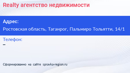 Realty, агентство недвижимости по адресу Ростовская область, Таганрог, Пальмиро Тольятти, 14/1 в дальнейшем Организация, размещена в следующих категориях: