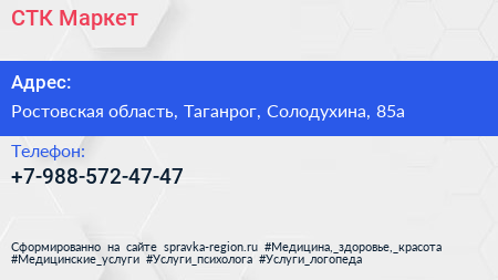 СТК Маркет по адресу Ростовская область, Таганрог, Солодухина, 85а в дальнейшем Организация, размещена в следующих категориях: