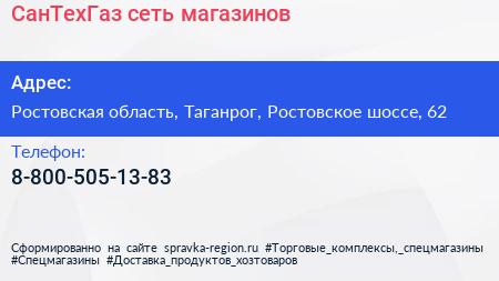СанТехГаз, сеть магазинов по адресу Ростовская область, Таганрог, Ростовское шоссе, 62 в дальнейшем Организация, размещена в следующих категориях: