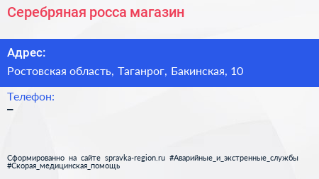 Серебряная росса, магазин по адресу Ростовская область, Таганрог, Бакинская, 10 в дальнейшем Организация, размещена в следующих категориях:
