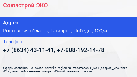 Союзстрой ЭКО по адресу Ростовская область, Таганрог, Победы, 100/а в дальнейшем Организация, размещена в следующих категориях: