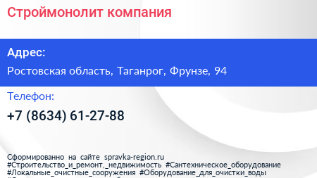 Строймонолит, компания по адресу Ростовская область, Таганрог, Фрунзе, 94 в дальнейшем Организация, размещена в следующих категориях: