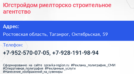 Югстройдом, риелторско-строительное агентство по адресу Ростовская область, Таганрог, Октябрьская, 59 в дальнейшем Организация, размещена в следующих категориях: