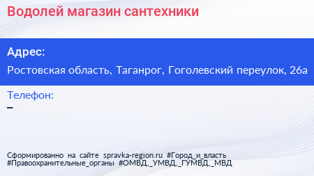 Водолей, магазин сантехники по адресу Ростовская область, Таганрог, Гоголевский переулок, 26а в дальнейшем Организация, размещена в следующих категориях: