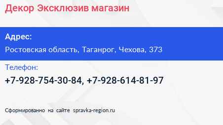 Декор Эксклюзив, магазин по адресу Ростовская область, Таганрог, Чехова, 373 в дальнейшем Организация, размещена в следующих категориях: