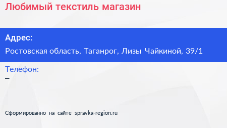 Любимый текстиль, магазин по адресу Ростовская область, Таганрог, Лизы Чайкиной, 39/1 в дальнейшем Организация, размещена в следующих категориях: