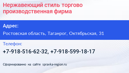 Нержавеющий стиль, торгово-производственная фирма по адресу Ростовская область, Таганрог, Октябрьская, 31 в дальнейшем Организация, размещена в следующих категориях: