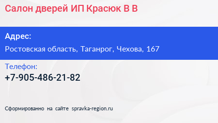 Салон дверей, ИП Красюк В.В. по адресу Ростовская область, Таганрог, Чехова, 167 в дальнейшем Организация, размещена в следующих категориях: