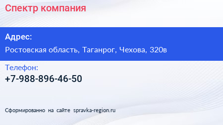 Спектр, компания по адресу Ростовская область, Таганрог, Чехова, 320в в дальнейшем Организация, размещена в следующих категориях: