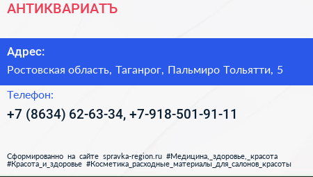 АНТИКВАРИАТЪ по адресу Ростовская область, Таганрог, Пальмиро Тольятти, 5 в дальнейшем Организация, размещена в следующих категориях: