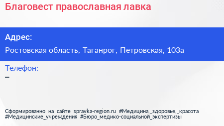 Благовест, православная лавка по адресу Ростовская область, Таганрог, Петровская, 103а в дальнейшем Организация, размещена в следующих категориях: