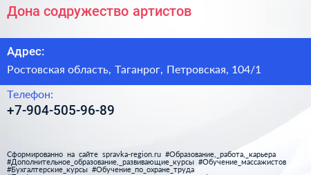 Дона, содружество артистов по адресу Ростовская область, Таганрог, Петровская, 104/1 в дальнейшем Организация, размещена в следующих категориях: