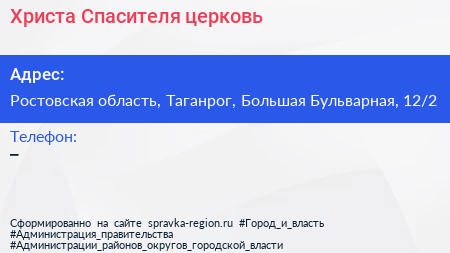 Христа Спасителя, церковь по адресу Ростовская область, Таганрог, Большая Бульварная, 12/2 в дальнейшем Организация, размещена в следующих категориях: