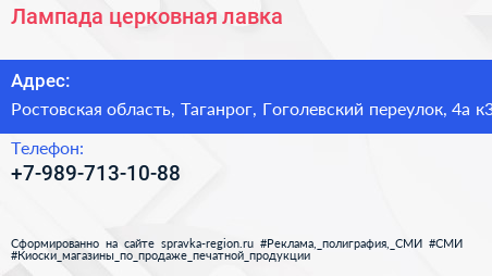 Лампада, церковная лавка по адресу Ростовская область, Таганрог, Гоголевский переулок, 4а к3 в дальнейшем Организация, размещена в следующих категориях: