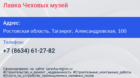 Лавка Чеховых, музей по адресу Ростовская область, Таганрог, Александровская, 100 в дальнейшем Организация, размещена в следующих категориях: