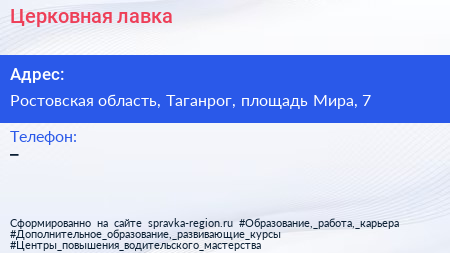 Церковная лавка по адресу Ростовская область, Таганрог, площадь Мира, 7 в дальнейшем Организация, размещена в следующих категориях: