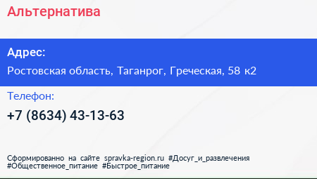 Альтернатива по адресу Ростовская область, Таганрог, Греческая, 58 к2 в дальнейшем Организация, размещена в следующих категориях: