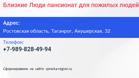 Близкие Люди, пансионат для пожилых людей по адресу Ростовская область, Таганрог, Акушерская, 32 в дальнейшем Организация, размещена в следующих категориях: