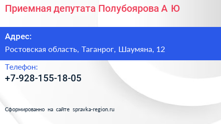Приемная депутата Полубоярова А.Ю. по адресу Ростовская область, Таганрог, Шаумяна, 12 в дальнейшем Организация, размещена в следующих категориях: