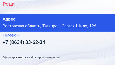 Рэди по адресу Ростовская область, Таганрог, Сергея Шило, 196 в дальнейшем Организация, размещена в следующих категориях: