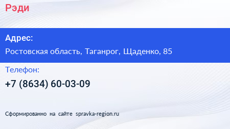 Рэди по адресу Ростовская область, Таганрог, Щаденко, 85 в дальнейшем Организация, размещена в следующих категориях: