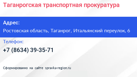 Таганрогская транспортная прокуратура по адресу Ростовская область, Таганрог, Итальянский переулок, 6 в дальнейшем Организация, размещена в следующих категориях: