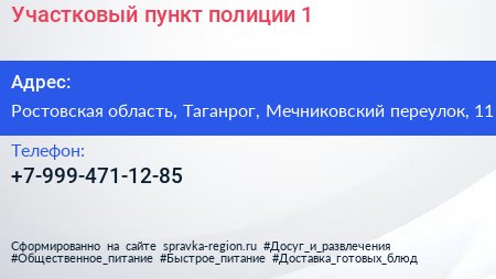 Участковый пункт полиции №1 по адресу Ростовская область, Таганрог, Мечниковский переулок, 11 в дальнейшем Организация, размещена в следующих категориях: