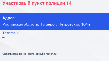 Участковый пункт полиции №14 по адресу Ростовская область, Таганрог, Петровская, 104и в дальнейшем Организация, размещена в следующих категориях: