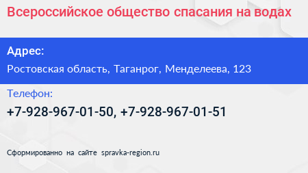 Всероссийское общество спасания на водах по адресу Ростовская область, Таганрог, Менделеева, 123 в дальнейшем Организация, размещена в следующих категориях: