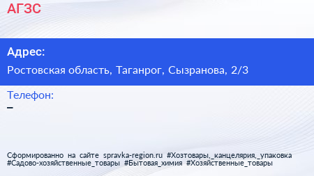 АГЗС по адресу Ростовская область, Таганрог, Сызранова, 2/3 в дальнейшем Организация, размещена в следующих категориях: