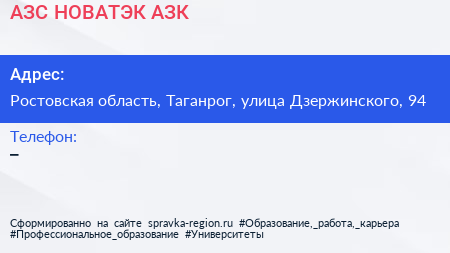 АЗС, НОВАТЭК-АЗК по адресу Ростовская область, Таганрог, улица Дзержинского, 94 в дальнейшем Организация, размещена в следующих категориях: