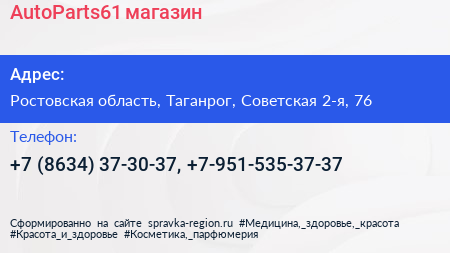 AutoParts61, магазин по адресу Ростовская область, Таганрог, Советская 2-я, 76 в дальнейшем Организация, размещена в следующих категориях: