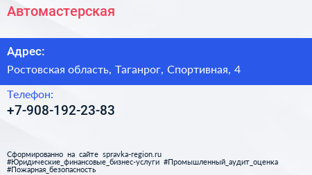 Автомастерская по адресу Ростовская область, Таганрог, Спортивная, 4 в дальнейшем Организация, размещена в следующих категориях: