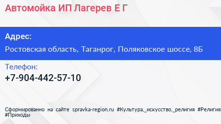 Автомойка, ИП Лагерев Е.Г. по адресу Ростовская область, Таганрог, Поляковское шоссе, 8Б в дальнейшем Организация, размещена в следующих категориях: