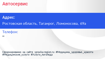 Автосервис по адресу Ростовская область, Таганрог, Ломоносова, 69а в дальнейшем Организация, размещена в следующих категориях:
