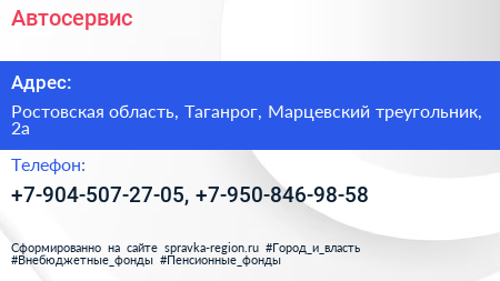 Автосервис по адресу Ростовская область, Таганрог, Марцевский треугольник, 2а в дальнейшем Организация, размещена в следующих категориях: