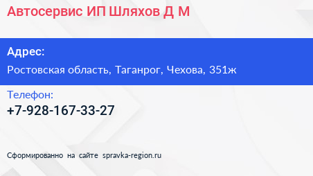 Автосервис, ИП Шляхов Д.М. по адресу Ростовская область, Таганрог, Чехова, 351ж в дальнейшем Организация, размещена в следующих категориях: