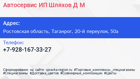 Автосервис, ИП Шляхов Д.М. по адресу Ростовская область, Таганрог, 20-й переулок, 50а в дальнейшем Организация, размещена в следующих категориях: