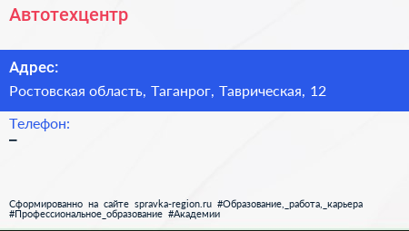 Автотехцентр по адресу Ростовская область, Таганрог, Таврическая, 12 в дальнейшем Организация, размещена в следующих категориях: