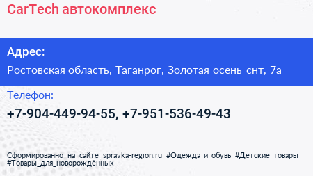 CarTech, автокомплекс по адресу Ростовская область, Таганрог, Золотая осень снт, 7а в дальнейшем Организация, размещена в следующих категориях: