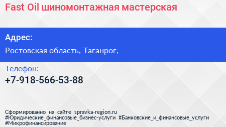 Fast Oil, шиномонтажная мастерская по адресу Ростовская область, Таганрог, в дальнейшем Организация, размещена в следующих категориях: