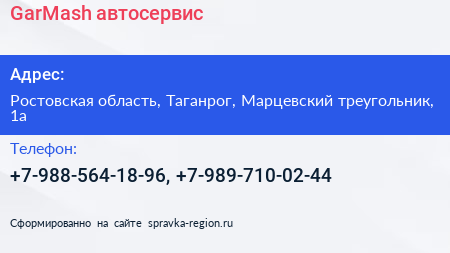GarMash, автосервис по адресу Ростовская область, Таганрог, Марцевский треугольник, 1а в дальнейшем Организация, размещена в следующих категориях: