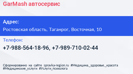 GarMash, автосервис по адресу Ростовская область, Таганрог, Восточная, 10 в дальнейшем Организация, размещена в следующих категориях: